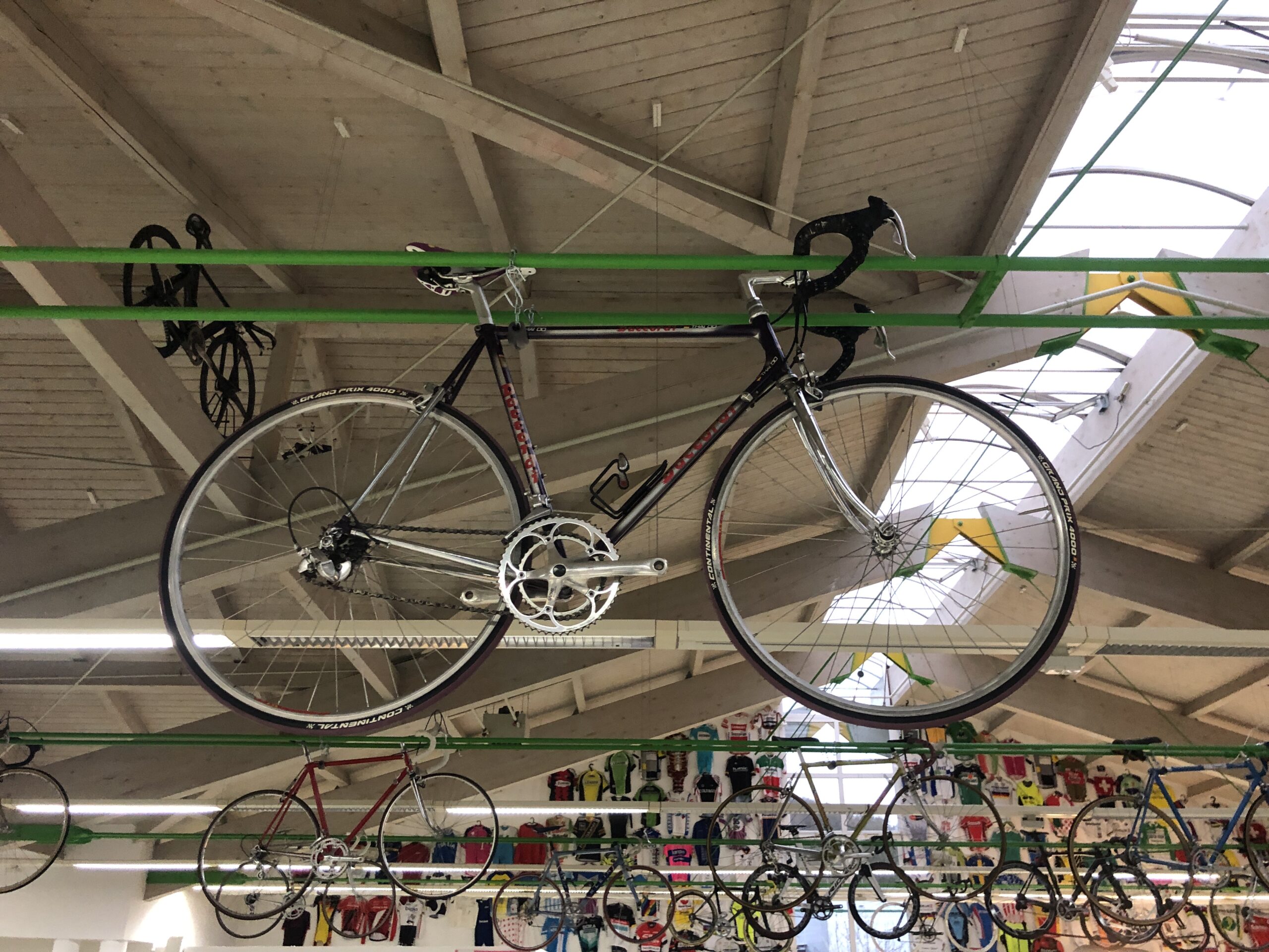 Endlich war es so weit. Am vergangenen Samstag bin ich nach Hüttlingen gefahren um Thai Do in seinem Fahrradmuseum kennen zu lernen. Hierzu hat Thai bei seinem Freund Wolfgang Mangold, der Inhaber des Radgeschäfts „Bikes and More“ ist in seiner großen Halle Platz für einen Teil seiner Räder erhalten. Beim Betreten der Halle kam mir sofort das berühmte Radmuseum „Museo del Ciclismo“ in der Nähe des Comer Sees bei Bellagio in den Sinn. So viele Räder auf einem Haufen, unzählige signierte Radtrikots an der Wand, das ist ja fast nicht zu glauben.