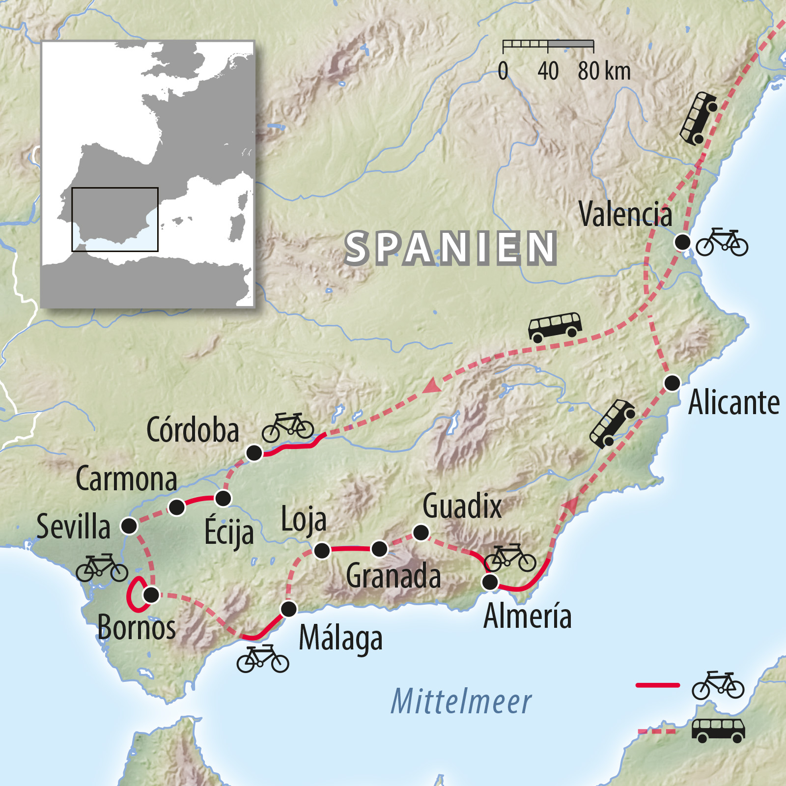 Eine Reise voller Kontraste erwartet uns. Es geht über die Mittelmeerküste nach Katalonien, weiter durch die Weiten Andalusiens mit ihren einzigartigen Städten und Dörfern, bis hin zu den weißen Stränden der Costa del Sol. Unterwegs erleben wir das pulsierende Leben in Sevilla, die maurische Kultur in Córdoba und Granada, die landschaftliche Schönheit der Pueblos Blancos und die mediterrane Leichtigkeit an der Küste. Jeden Tag warten kleine, aber feine Radtouren – ideal, um die Seele Spaniens hautnah zu erfahren. Auf der Rückreise nehmen wir die Eindrücke mit nach Hause, gestärkt von Sonne, Kultur und Bewegung.