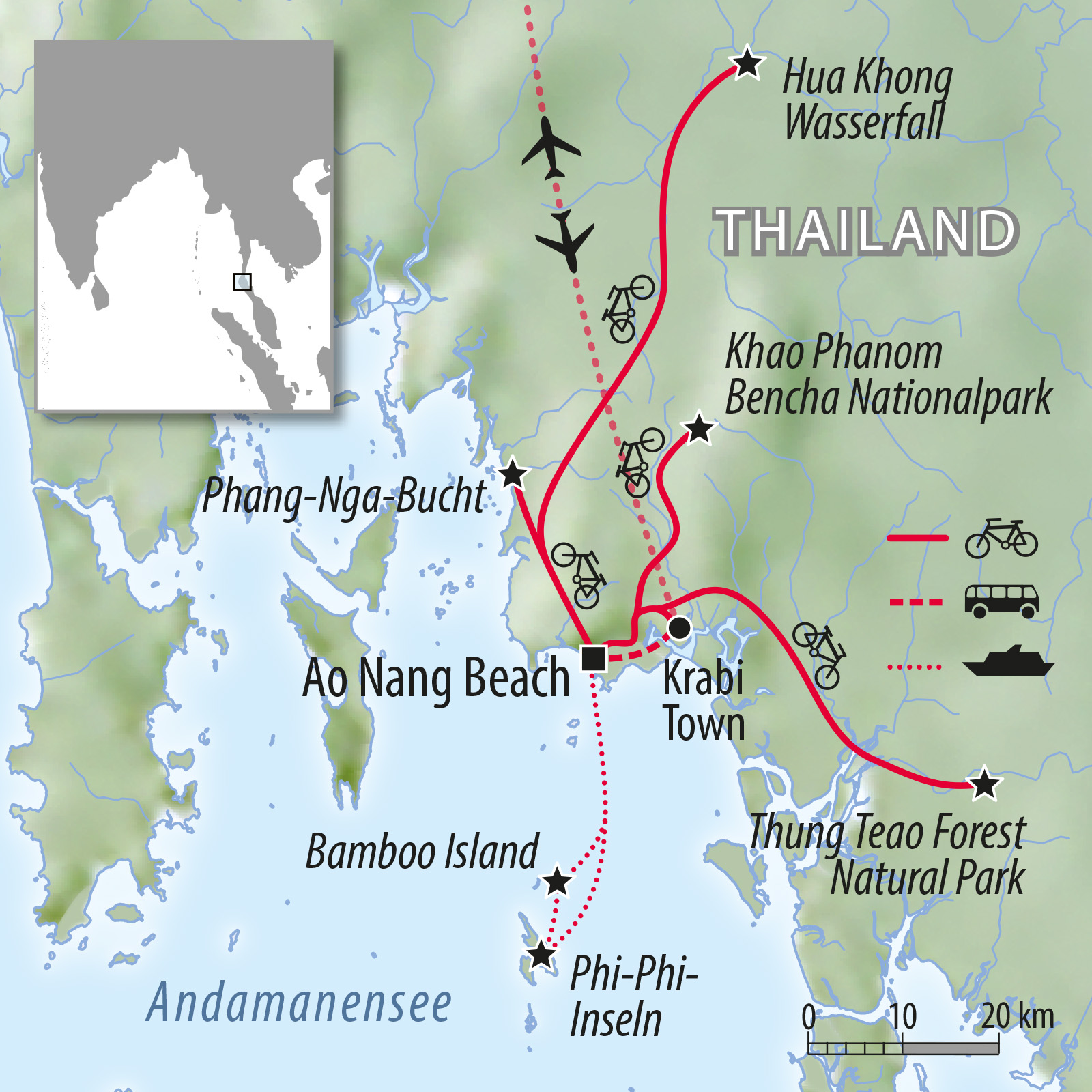 Die abwechslungsreichen Landschaften Südthailands entdecken Sie überwiegend auf Nebenstraßen und Landwegen rund um Krabi, Ao Nang und die umliegenden Nationalparks. Die Tagesetappen liegen meist zwischen 30 und 50 Kilometern und führen durch tropische Vegetation, entlang der Küste sowie durch ländliche Regionen mit kleinen Dörfern. Der Untergrund besteht überwiegend aus asphaltierten Straßen, vereinzelt aus Nebenwegen. Kurze Anstiege sind möglich, insgesamt ist das Streckenprofil jedoch moderat. Ergänzt werden die Radtage durch Wanderungen, Naturbesuche und einen Bootsausflug zu den Phi-Phi-Inseln, sodass sich aktive Etappen und erholsame Passagen ausgewogen abwechseln.