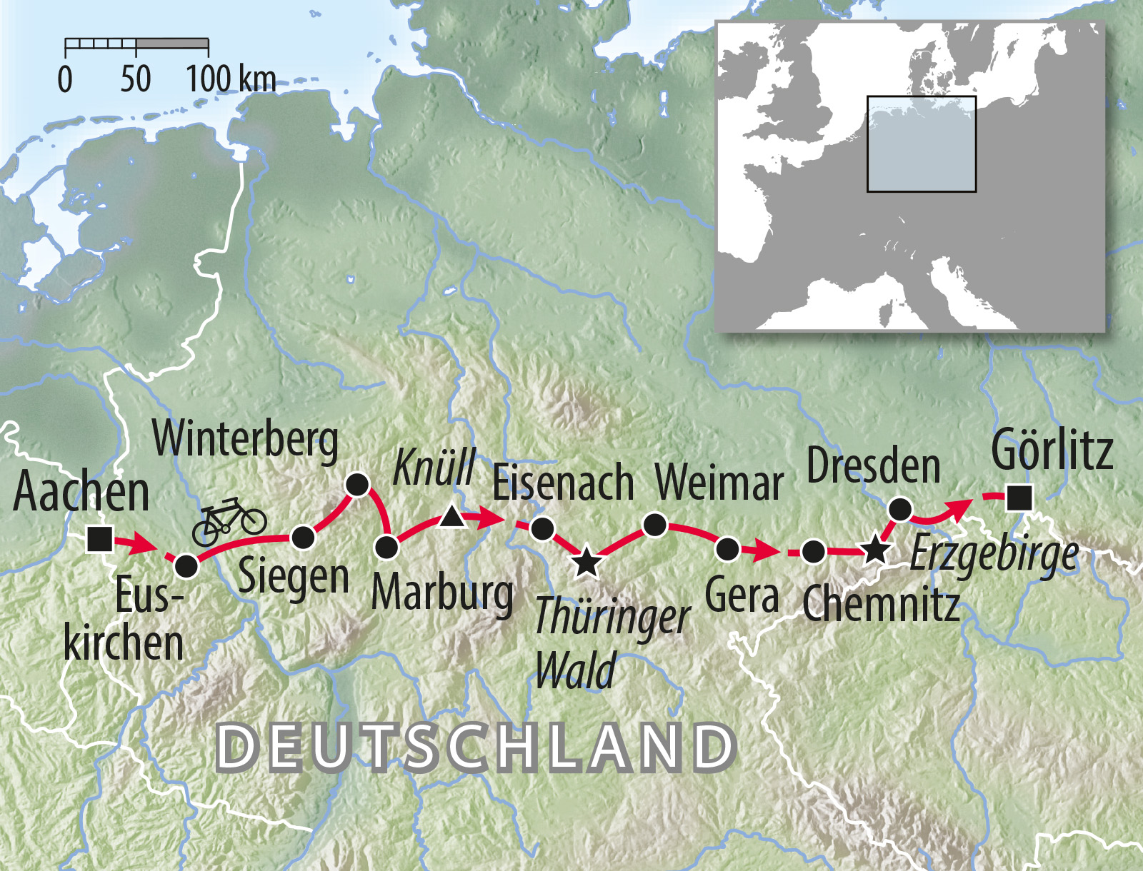 Quer durch Deutschland, das heißt von Aachen nach Görlitz oder vom Dreiländereck Belgien, Niederlande Deutschland an die Grenze Deutschland mit Polen. Diese Rennradtour von der sanften Hügellandschaft der Eifel bis an die deutsch-polnische Grenze bei Görlitz – eine abwechslungsreiche Strecke durch Mittelgebirge, Wälder, historische Städte und das malerische Erzgebirge. Die Tour kombiniert anspruchsvolle Steigungen mit kulturellen Highlights und bietet immer wieder atemberaubende Ausblicke.